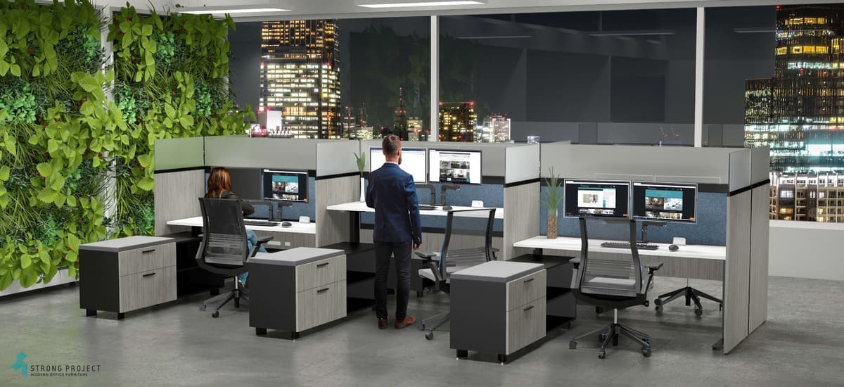 This Post-COVID open office workstation design will allow employers to create a workplace design that will support health and promote productivity as well as offering a nice blend of personal privacy & shielding while still providing an open feel letting natural light in. This stylish modular office furniture system will give you the flexibility to create a work environment that provides users with their own sense of space, fosters creativity and well-being and can be customized from a design perspective to meld with your building interior and brand.