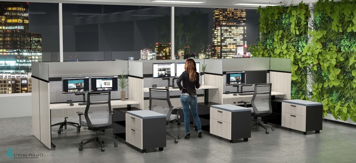 This Post-COVID open office workstation design will allow employers to create a workplace design that will support health and promote productivity as well as offering a nice blend of personal privacy & shielding while still providing an open feel letting natural light in. This stylish modular office furniture system will give you the flexibility to create a work environment that provides users with their own sense of space, fosters creativity and well-being and can be customized from a design perspective to meld with your building interior and brand.