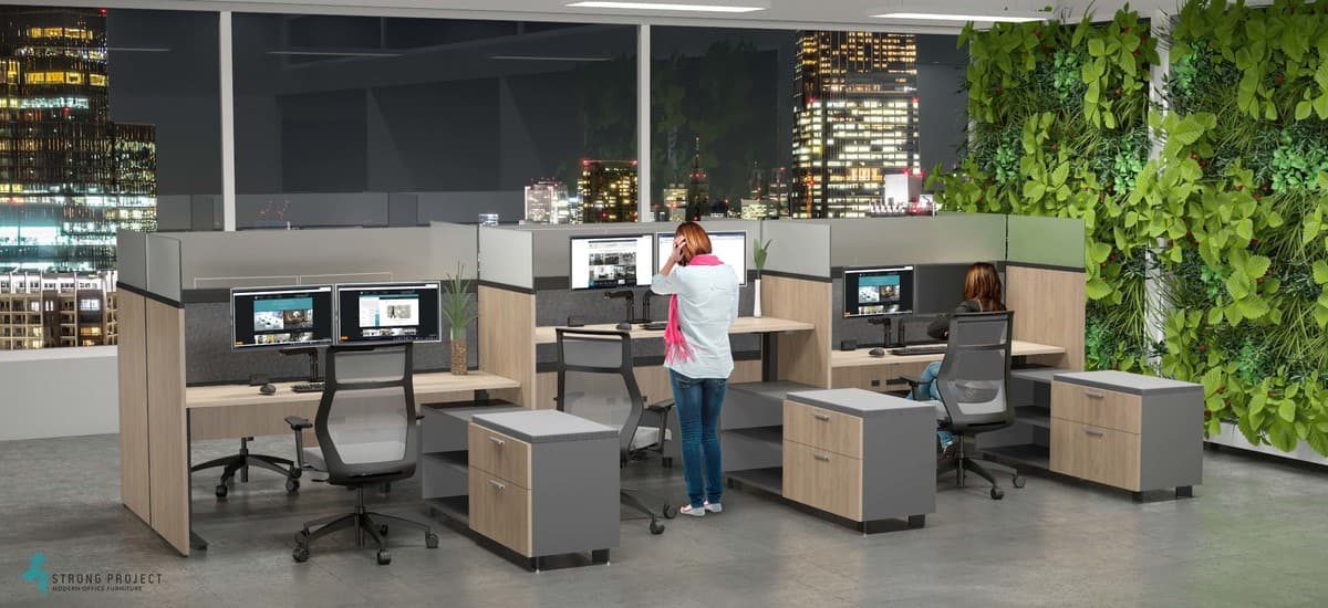 This Post-COVID open office workstation design will allow employers to create a workplace design that will support health and promote productivity as well as offering a nice blend of personal privacy & shielding while still providing an open feel letting natural light in. This stylish modular office furniture system will give you the flexibility to create a work environment that provides users with their own sense of space, fosters creativity and well-being and can be customized from a design perspective to meld with your building interior and brand.