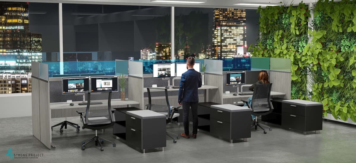 This Post-COVID open office workstation design will allow employers to create a workplace design that will support health and promote productivity as well as offering a nice blend of personal privacy & shielding while still providing an open feel letting natural light in. This stylish modular office furniture system will give you the flexibility to create a work environment that provides users with their own sense of space, fosters creativity and well-being and can be customized from a design perspective to meld with your building interior and brand.