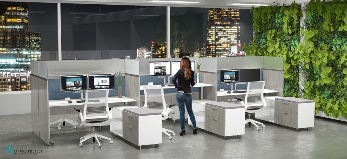 This Post-COVID open office workstation design will allow employers to create a workplace design that will support health and promote productivity as well as offering a nice blend of personal privacy & shielding while still providing an open feel letting natural light in. This stylish modular office furniture system will give you the flexibility to create a work environment that provides users with their own sense of space, fosters creativity and well-being and can be customized from a design perspective to meld with your building interior and brand.