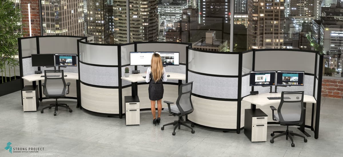 This curved height-adjustable cubicle “Zig-Zag design” is 67”H, so that there is sufficient shielding if someone were to cough or sneeze at their desk. The workstation components are made of easily cleanable materials such as laminate, acrylic and marker board. Shown in a 67”H x 60”W Worksurfaces.