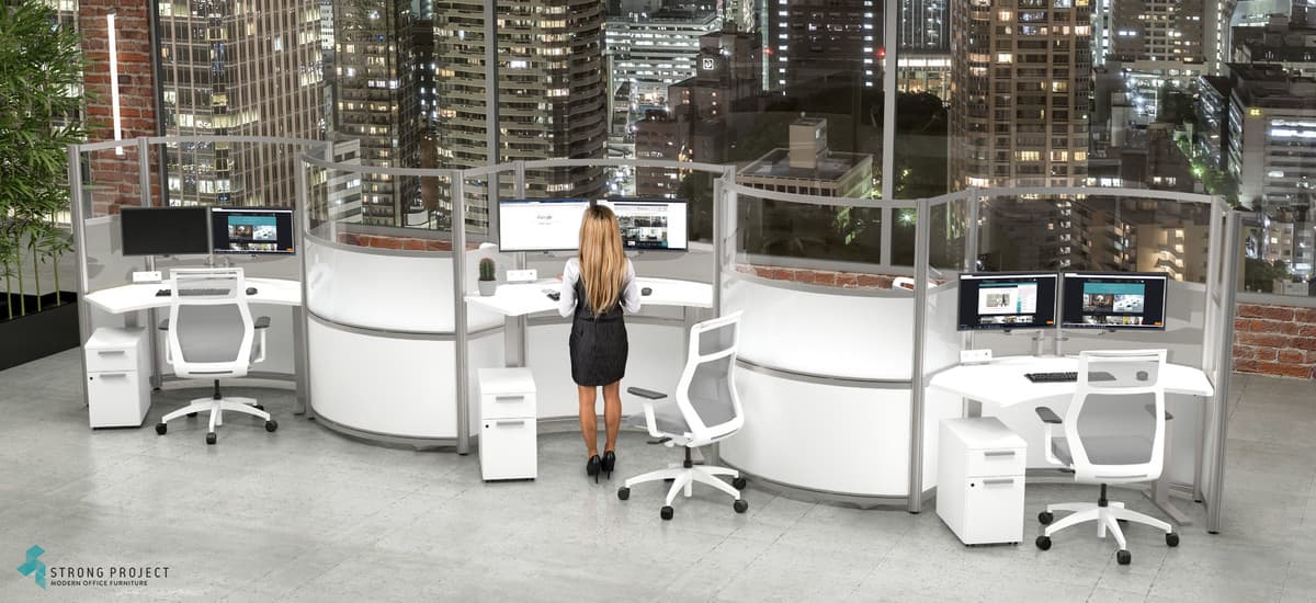 This curved height-adjustable cubicle “Zig-Zag design” is 67”H, so that there is sufficient shielding if someone were to cough or sneeze at their desk. The workstation components are made of easily cleanable materials such as laminate, acrylic and marker board. Shown in a 67”H x 60”W Worksurfaces.