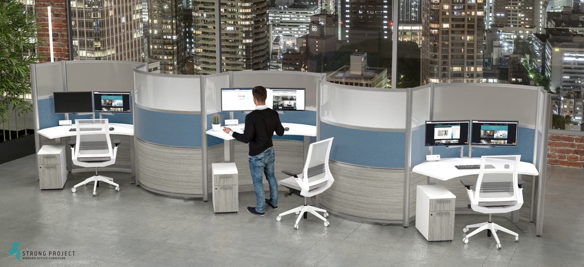 This curved height-adjustable cubicle “Zig-Zag design” is 67”H, so that there is sufficient shielding if someone were to cough or sneeze at their desk. The workstation components are made of easily cleanable materials such as laminate, acrylic and marker board. Shown in a 67”H x 60”W Worksurfaces.