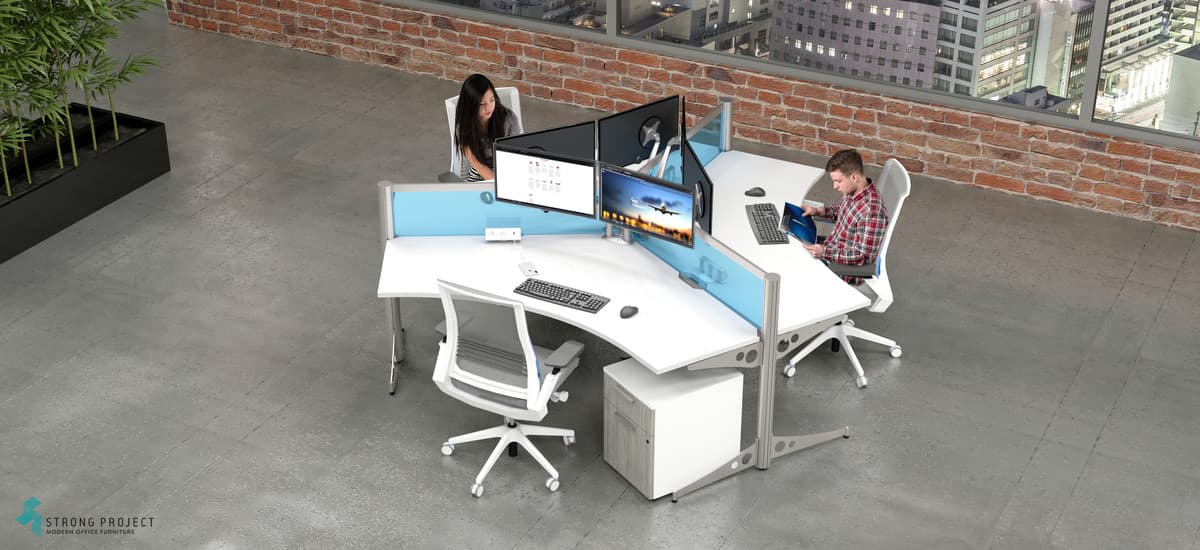 The efficient angles of this open, collaborative cubicle design allows businesses to optimize on their available square footage by allowing for a higher number of seats than most linear designs while still providing a sense of openness. When placed in an open plan, the geometry of the pods provides a more organic flow than rows and rows of liner cubicles. Available with or without rounded collaboration ends.