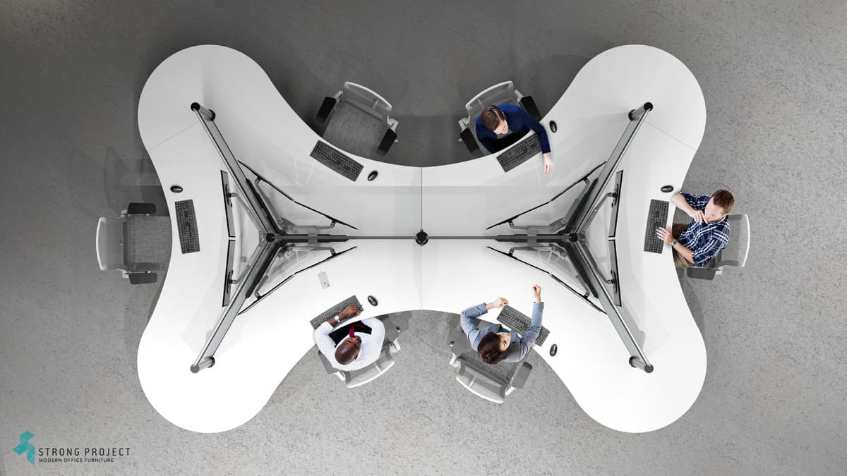 The efficient angles of this open, collaborative cubicle design allows businesses to optimize on their available square footage by allowing for a higher number of seats than most linear designs while still providing a sense of openness. When placed in an open plan, the geometry of the pods provides a more organic flow than rows and rows of liner cubicles. Available with or without rounded collaboration ends.