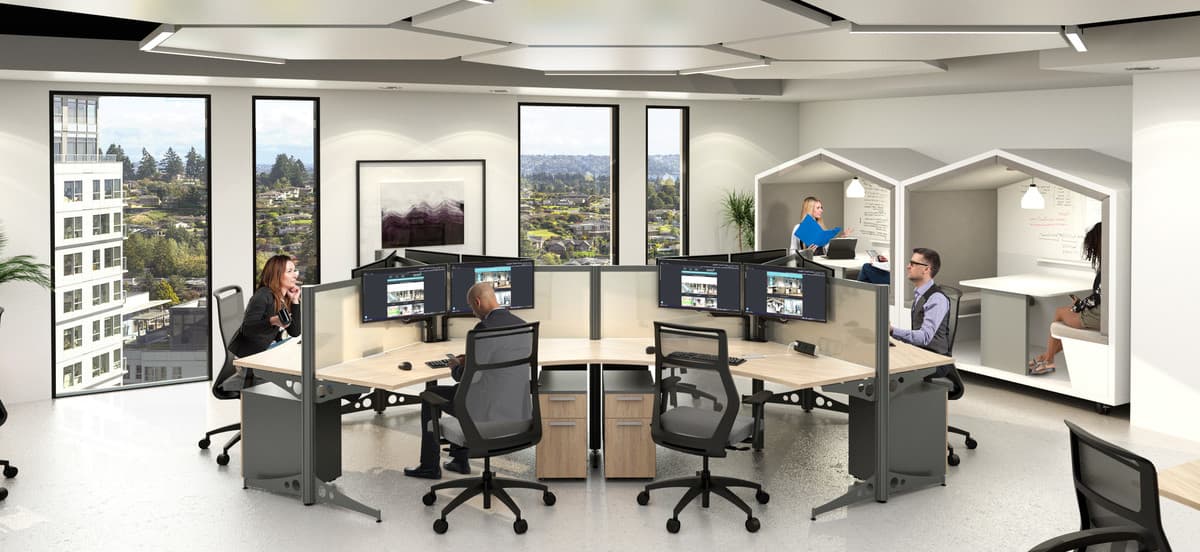 The efficient angles of this open, collaborative cubicle design allows businesses to optimize on their available square footage by allowing for a higher number of seats than most linear designs while still providing a sense of openness. When placed in an open plan, the geometry of the pods provides a more organic flow than rows and rows of liner cubicles. Available with or without rounded collaboration ends.