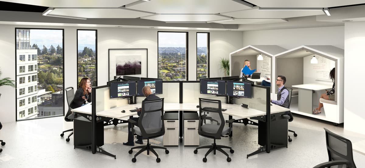 The efficient angles of this open, collaborative cubicle design allows businesses to optimize on their available square footage by allowing for a higher number of seats than most linear designs while still providing a sense of openness. When placed in an open plan, the geometry of the pods provides a more organic flow than rows and rows of liner cubicles. Available with or without rounded collaboration ends.