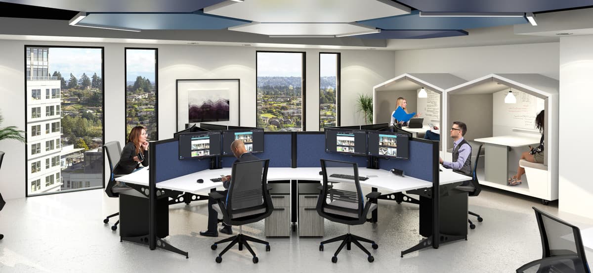 The efficient angles of this open, collaborative cubicle design allows businesses to optimize on their available square footage by allowing for a higher number of seats than most linear designs while still providing a sense of openness. When placed in an open plan, the geometry of the pods provides a more organic flow than rows and rows of liner cubicles. Available with or without rounded collaboration ends.