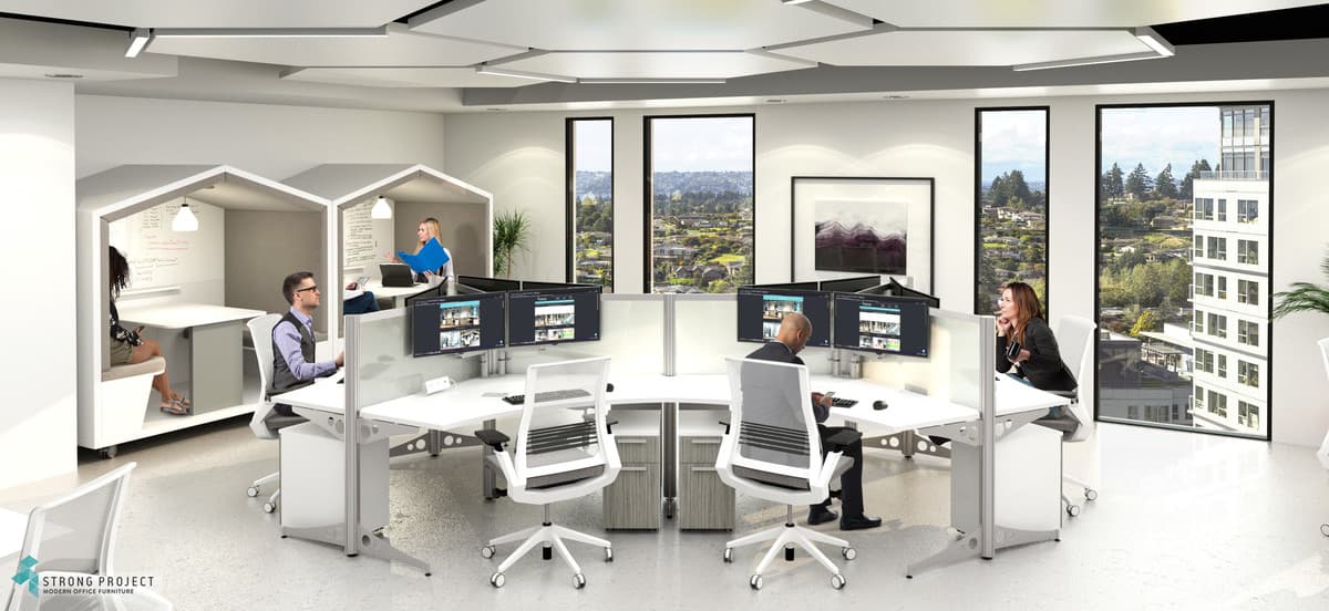 The efficient angles of this open, collaborative cubicle design allows businesses to optimize on their available square footage by allowing for a higher number of seats than most linear designs while still providing a sense of openness. When placed in an open plan, the geometry of the pods provides a more organic flow than rows and rows of liner cubicles. Available with or without rounded collaboration ends.