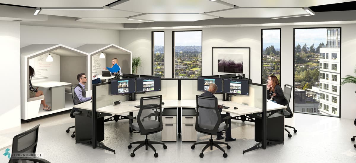 The efficient angles of this open, collaborative cubicle design allows businesses to optimize on their available square footage by allowing for a higher number of seats than most linear designs while still providing a sense of openness. When placed in an open plan, the geometry of the pods provides a more organic flow than rows and rows of liner cubicles. Available with or without rounded collaboration ends.