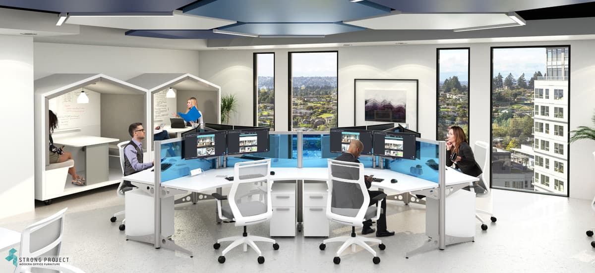 The efficient angles of this open, collaborative cubicle design allows businesses to optimize on their available square footage by allowing for a higher number of seats than most linear designs while still providing a sense of openness. When placed in an open plan, the geometry of the pods provides a more organic flow than rows and rows of liner cubicles. Available with or without rounded collaboration ends.