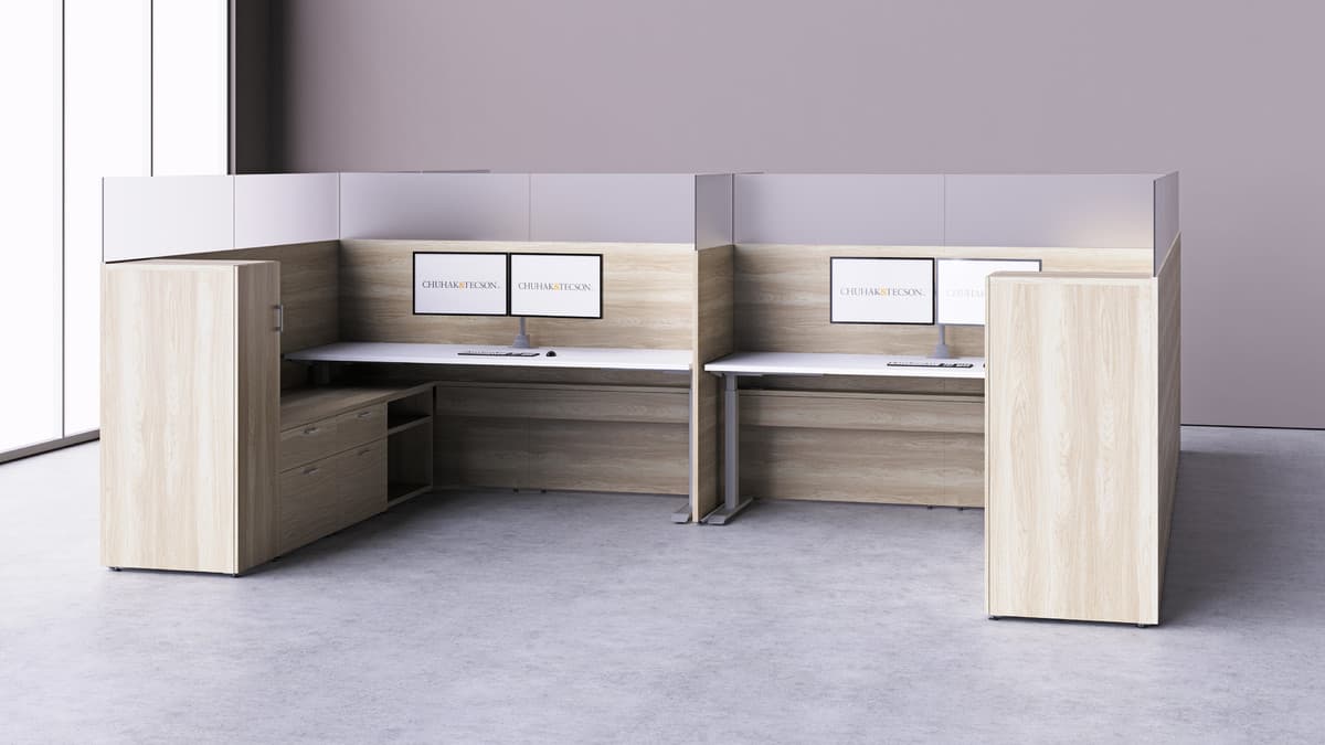 Our NEW monolithic frameless modern workstation panel system is available in both static height tops and height-adjustable tops for sit-stand desking capability.