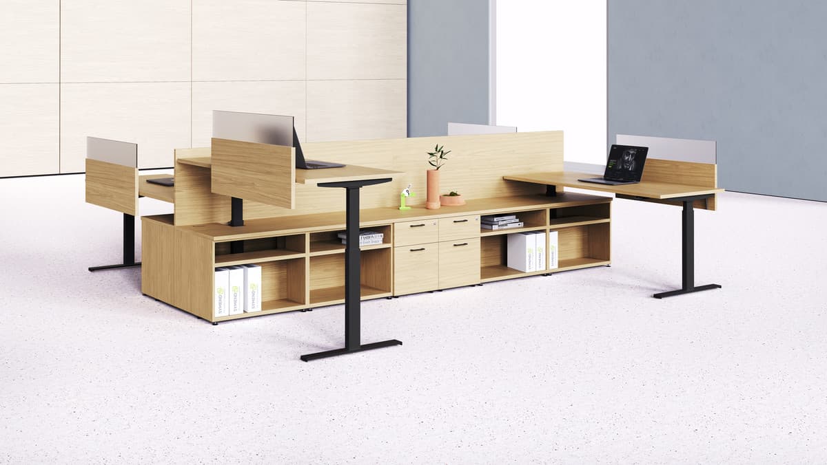 Our NEW monolithic frameless modern workstation panel system is available in both static height tops and height-adjustable tops for sit-stand desking capability.