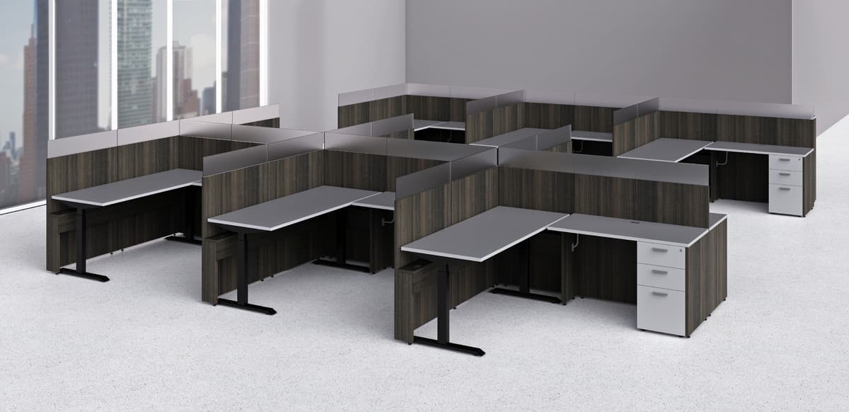 Our NEW monolithic frameless modern workstation panel system is available in both static height tops and height-adjustable tops for sit-stand desking capability.