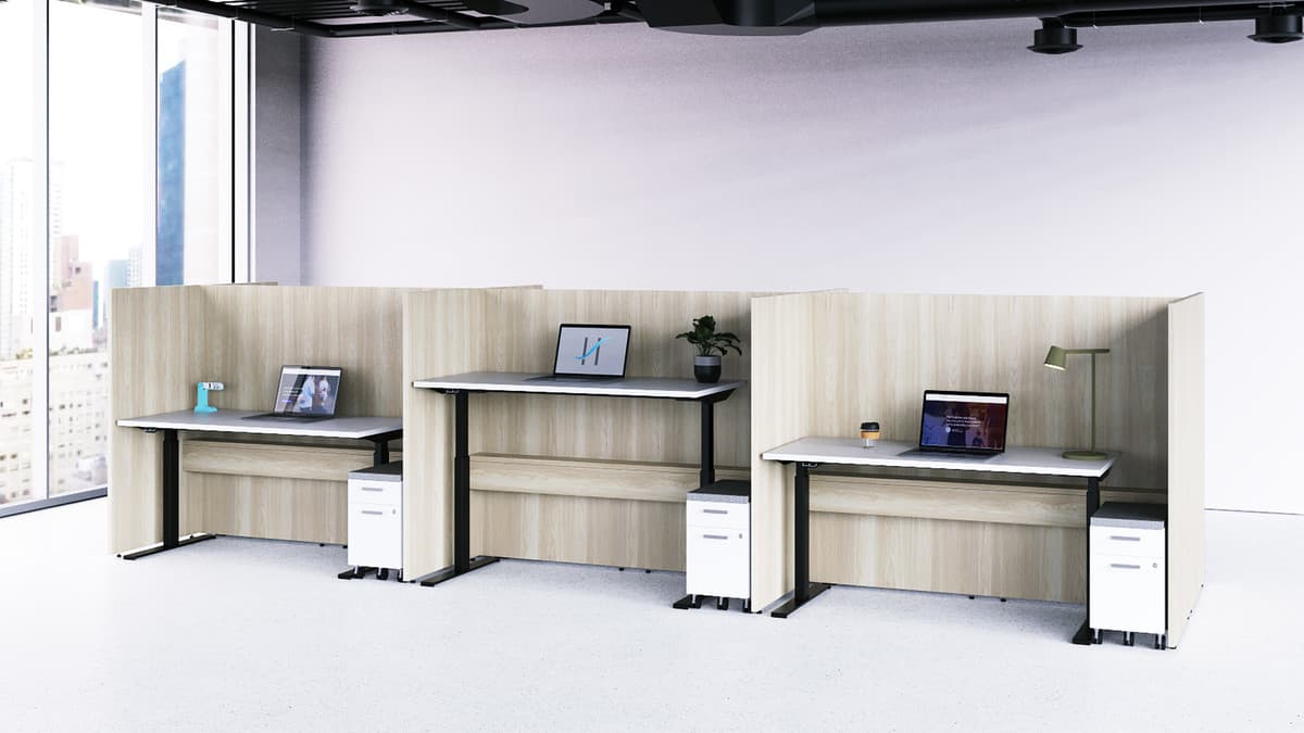Our NEW monolithic frameless modern workstation panel system is available in both static height tops and height-adjustable tops for sit-stand desking capability.