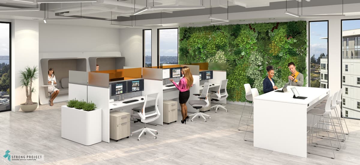 This Post-COVID open office workstation design will allow employers to create a workplace design that will support health and promote productivity as well as offering a nice blend of personal privacy & shielding while still providing an open feel letting natural light in. This stylish modular office furniture system will give you the flexibility to create a work environment that provides users with their own sense of space, fosters creativity and well-being and can be customized from a design perspective to meld with your building interior and brand.