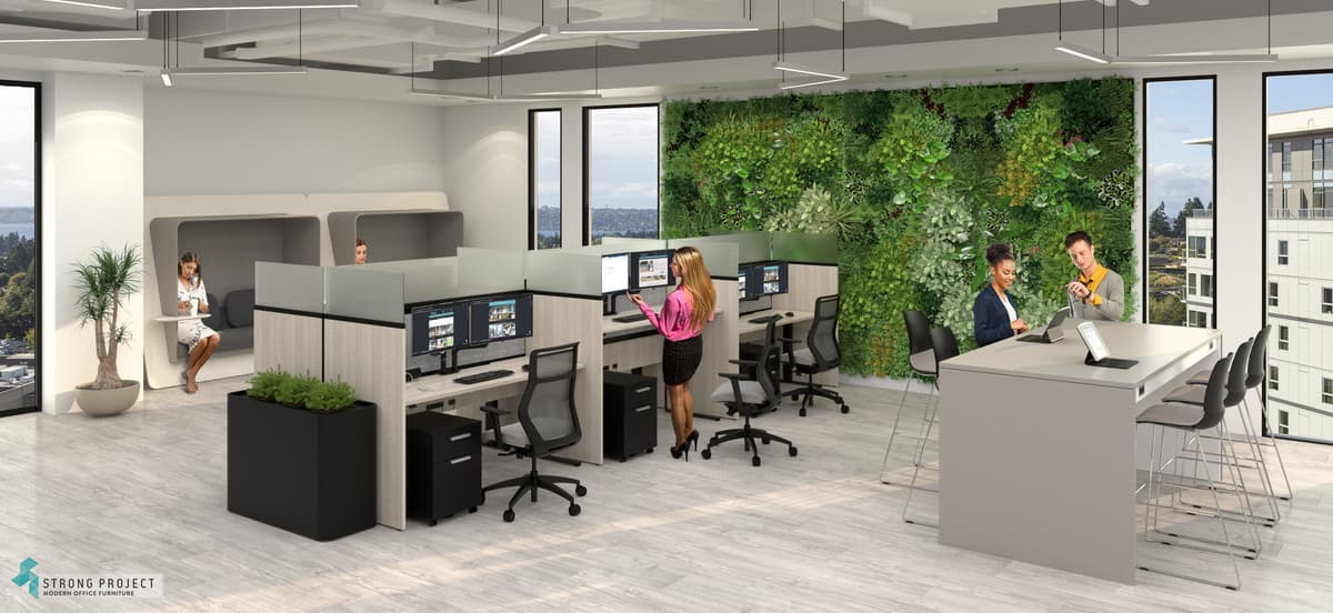 This Post-COVID open office workstation design will allow employers to create a workplace design that will support health and promote productivity as well as offering a nice blend of personal privacy & shielding while still providing an open feel letting natural light in. This stylish modular office furniture system will give you the flexibility to create a work environment that provides users with their own sense of space, fosters creativity and well-being and can be customized from a design perspective to meld with your building interior and brand.
