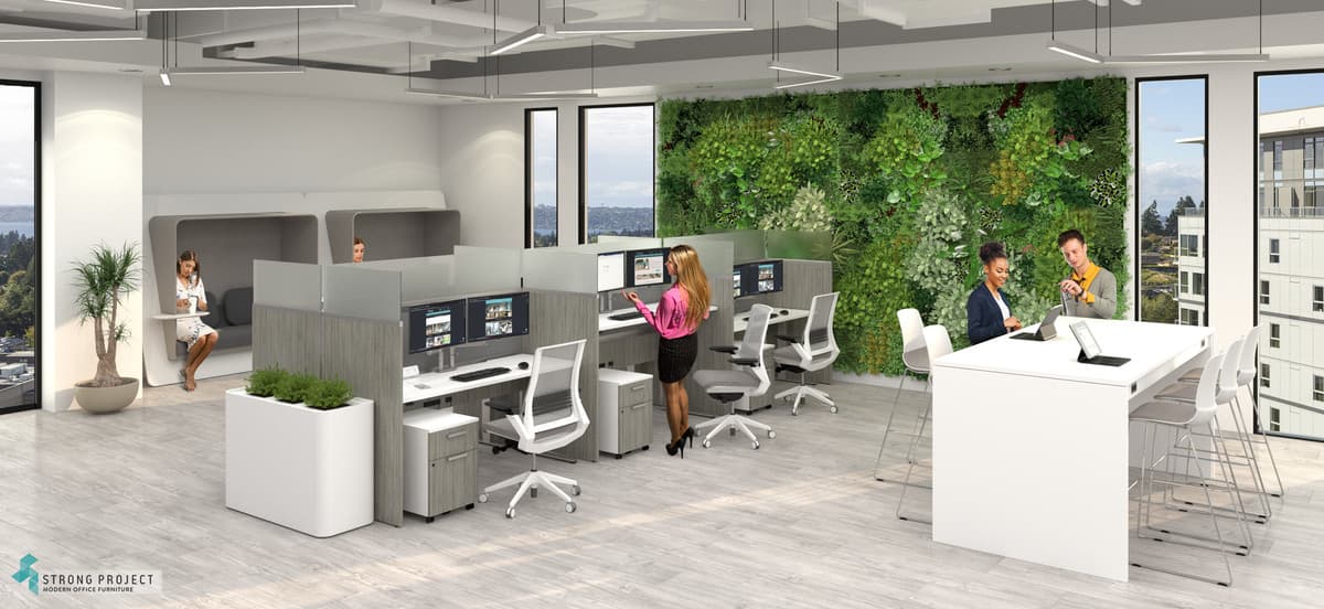 This Post-COVID open office workstation design will allow employers to create a workplace design that will support health and promote productivity as well as offering a nice blend of personal privacy & shielding while still providing an open feel letting natural light in. This stylish modular office furniture system will give you the flexibility to create a work environment that provides users with their own sense of space, fosters creativity and well-being and can be customized from a design perspective to meld with your building interior and brand.