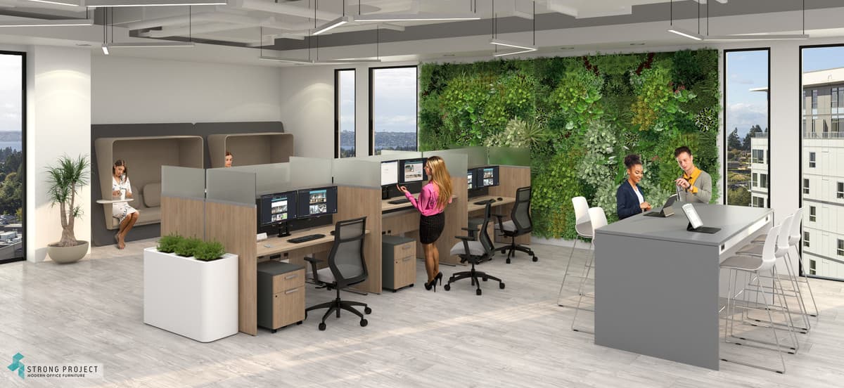 This Post-COVID open office workstation design will allow employers to create a workplace design that will support health and promote productivity as well as offering a nice blend of personal privacy & shielding while still providing an open feel letting natural light in. This stylish modular office furniture system will give you the flexibility to create a work environment that provides users with their own sense of space, fosters creativity and well-being and can be customized from a design perspective to meld with your building interior and brand.