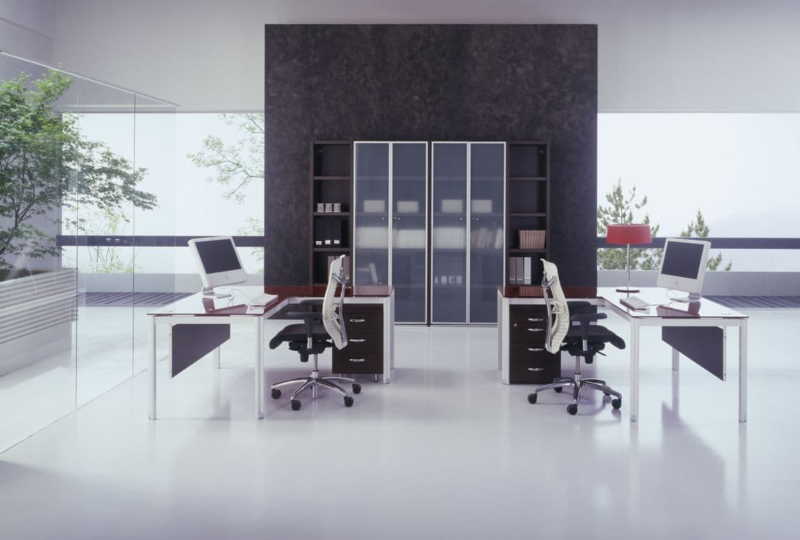 This modern glass desk design with a metal frame and legs is available in a number of sizes to fit any executive or shared office. It can be configured as a rectangular Table Desk, an L-Shape Desk or an integrated Shared Desk composition with a privacy screen. Numerous coordinating storage options are available in various sizes and finishes to fit any office space and satisfy any filing or general storage requirement.
