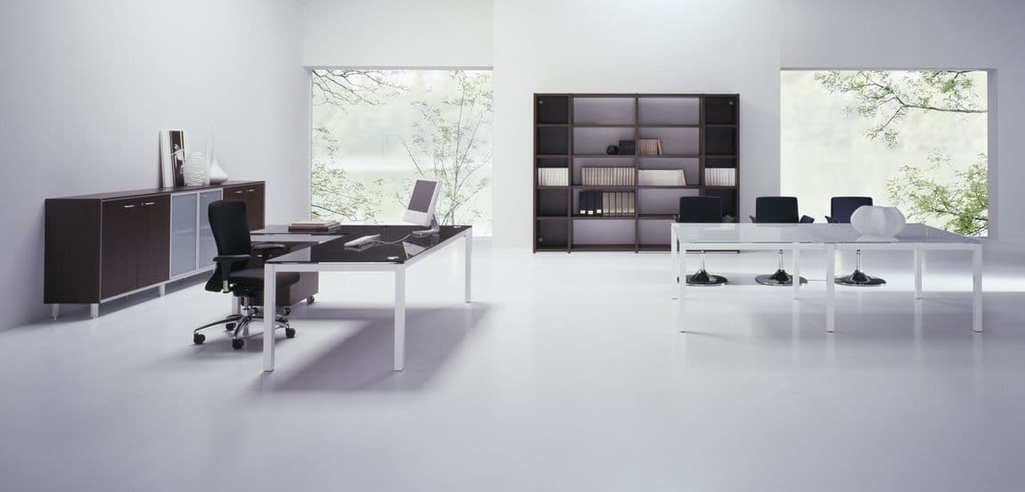This modern glass desk design with a metal frame and legs is available in a number of sizes to fit any executive or shared office. It can be configured as a rectangular Table Desk, an L-Shape Desk or an integrated Shared Desk composition with a privacy screen. Numerous coordinating storage options are available in various sizes and finishes to fit any office space and satisfy any filing or general storage requirement.