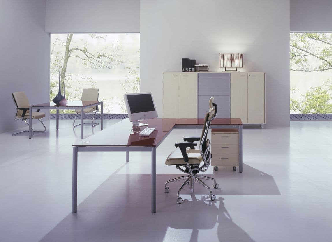 This modern glass desk design with a metal frame and legs is available in a number of sizes to fit any executive or shared office. It can be configured as a rectangular Table Desk, an L-Shape Desk or an integrated Shared Desk composition with a privacy screen. Numerous coordinating storage options are available in various sizes and finishes to fit any office space and satisfy any filing or general storage requirement.