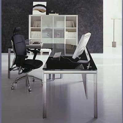 This modern glass desk design with a metal frame and legs is available in a number of sizes to fit any executive or shared office. It can be configured as a rectangular Table Desk, an L-Shape Desk or an integrated Shared Desk composition with a privacy screen. Numerous coordinating storage options are available in various sizes and finishes to fit any office space and satisfy any filing or general storage requirement.