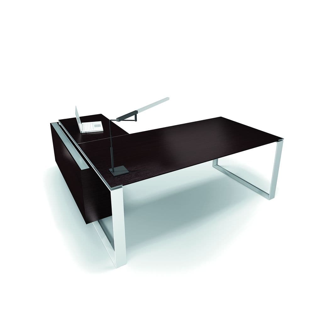 This luxury contemporary office desk series is a statement piece suited to the executive looking for clean, architectural lines and refined detailing. It can be configured as a rectangular Table Desk or an L-Shape Desk with an integrated storage compartment equipped with a flip top cable tray and 3 drawer storage pedestal. Desktops are in matte, scratch-resistant, non-reflective and washable thermofused laminate or satin, tempered, fingerprint-proof white glass. The legs are available in two versions: Open and Closed. They are made of steel with a trapezoid shape section and can be powder coated in a matte white finish or in polished chrome. Also available is a matching meeting table series as well as coordinating storage options.
