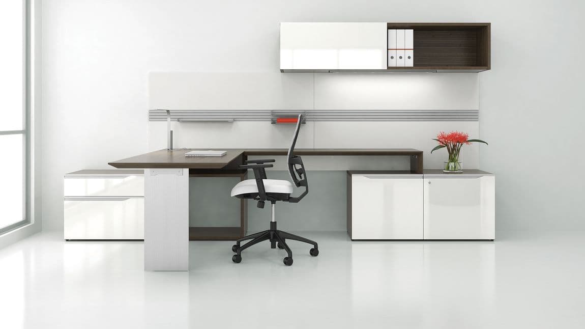 This modern office desk design features “floating' or “tiered' components that provide dimension and visual interest while packing ample “stackable' storage into a compact footprint. It can be configured as an L-Shape Desk, U-Shape desk or an integrated collaborative Shared Desk composition. All desk configurations are available in a number of sizes to fit any executive or shared office. The filing and storage components have sleek European continuous pulls and the design option of applying either Gloss White or Gloss Black laminate to the drawer facings for an ultra modern textural nuance. The extra-wide versions of the filing and storage drawers also include hidden internal cubbies to store items such as a purse or extra pair of shoes. Numerous solid or two-tone finish options are available for the desk and storage components to create the optimal modern desk design to meld with your office interior.
