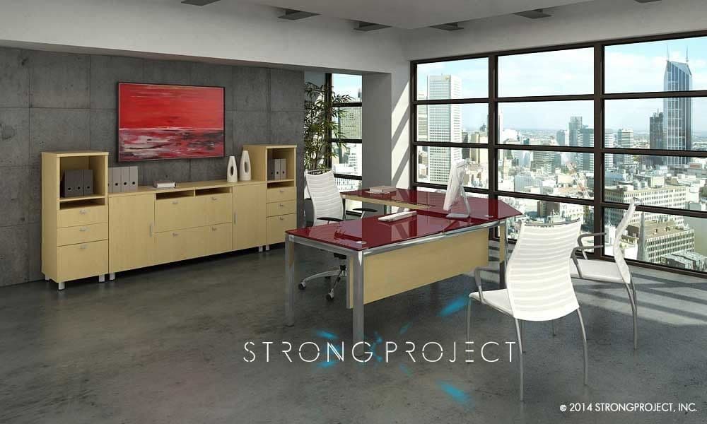 This modern glass desk design with a metal frame and legs is available in a number of sizes to fit any executive or shared office. It can be configured as a rectangular Table Desk, an L-Shape Desk or an integrated Shared Desk composition with a privacy screen. Numerous coordinating storage options are available in various sizes and finishes to fit any office space and satisfy any filing or general storage requirement.