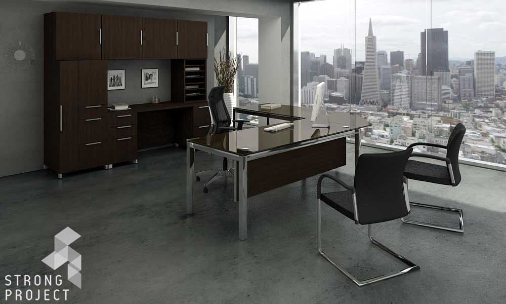 This modern glass desk design with a metal frame and legs is available in a number of sizes to fit any executive or shared office. It can be configured as a rectangular Table Desk, an L-Shape Desk or an integrated Shared Desk composition with a privacy screen. Numerous coordinating storage options are available in various sizes and finishes to fit any office space and satisfy any filing or general storage requirement.