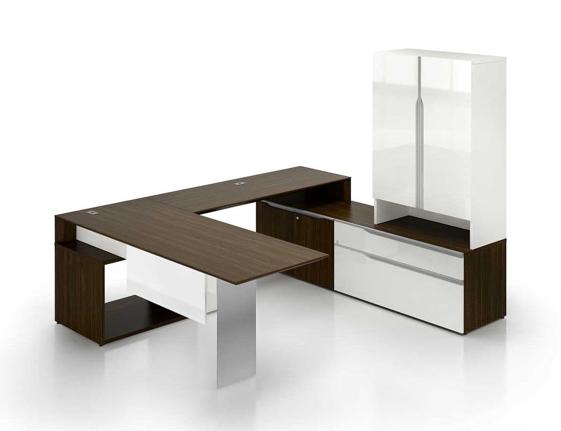 This modern office desk design features “floating' or “tiered' components that provide dimension and visual interest while packing ample “stackable' storage into a compact footprint. It can be configured as an L-Shape Desk, U-Shape desk or an integrated collaborative Shared Desk composition. All desk configurations are available in a number of sizes to fit any executive or shared office. The filing and storage components have sleek European continuous pulls and the design option of applying either Gloss White or Gloss Black laminate to the drawer facings for an ultra modern textural nuance. The extra-wide versions of the filing and storage drawers also include hidden internal cubbies to store items such as a purse or extra pair of shoes. Numerous solid or two-tone finish options are available for the desk and storage components to create the optimal modern desk design to meld with your office interior.