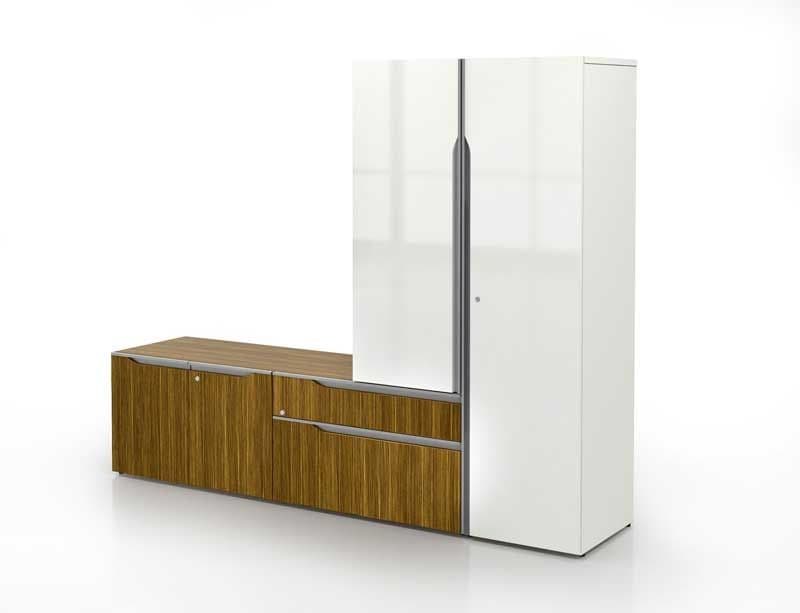 This modern office desk design features “floating' or “tiered' components that provide dimension and visual interest while packing ample “stackable' storage into a compact footprint. It can be configured as an L-Shape Desk, U-Shape desk or an integrated collaborative Shared Desk composition. All desk configurations are available in a number of sizes to fit any executive or shared office. The filing and storage components have sleek European continuous pulls and the design option of applying either Gloss White or Gloss Black laminate to the drawer facings for an ultra modern textural nuance. The extra-wide versions of the filing and storage drawers also include hidden internal cubbies to store items such as a purse or extra pair of shoes. Numerous solid or two-tone finish options are available for the desk and storage components to create the optimal modern desk design to meld with your office interior.