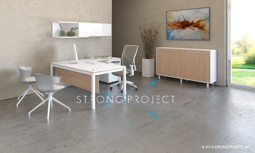 This contemporary office desk design is an ideal solution for businesses seeking a sleek, modern, tailored look and quality components at a price point geared toward staying within budget…especially on larger scale projects. This modern desk design features a durable thermofused laminate worksurface, metal frame and legs and is available in a number of sizes to fit any executive or shared office. It can be configured as a rectangular Table Desk, an L-Shape Desk or an integrated Shared Desk composition with a privacy screen.