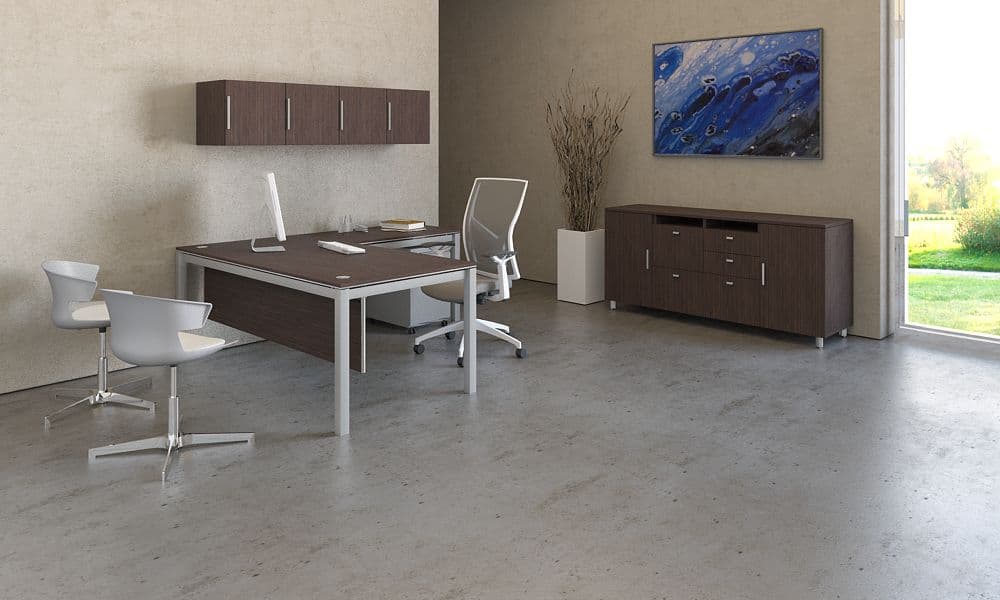 This contemporary office desk design is an ideal solution for businesses seeking a sleek, modern, tailored look and quality components at a price point geared toward staying within budget…especially on larger scale projects. This modern desk design features a durable thermofused laminate worksurface, metal frame and legs and is available in a number of sizes to fit any executive or shared office. It can be configured as a rectangular Table Desk, an L-Shape Desk or an integrated Shared Desk composition with a privacy screen.