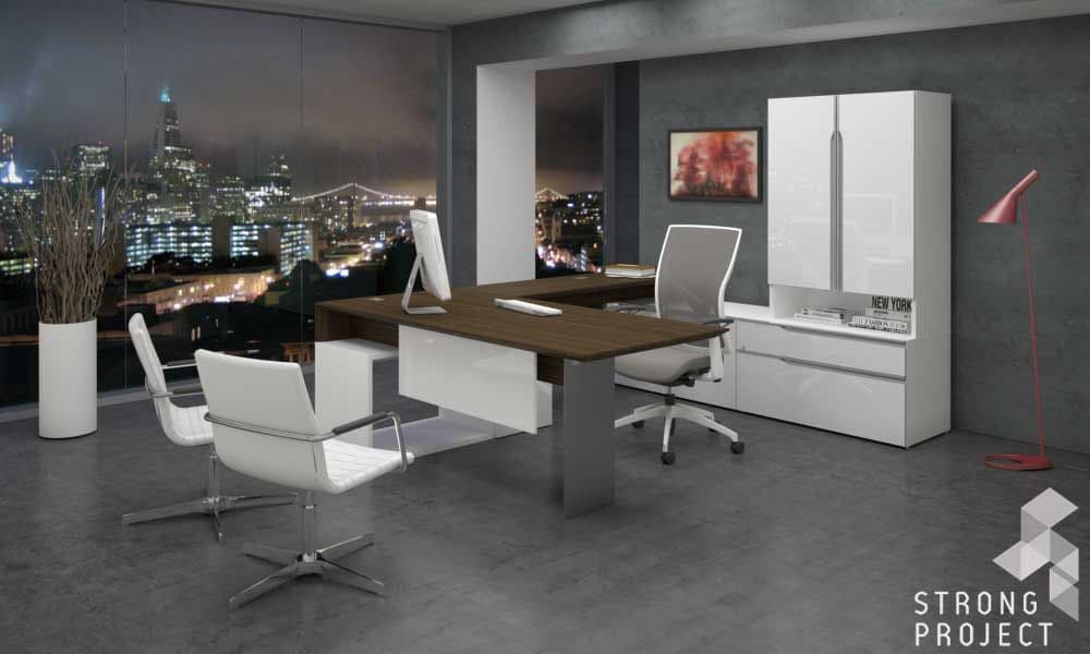 This modern office desk design features “floating' or “tiered' components that provide dimension and visual interest while packing ample “stackable' storage into a compact footprint. It can be configured as an L-Shape Desk, U-Shape desk or an integrated collaborative Shared Desk composition. All desk configurations are available in a number of sizes to fit any executive or shared office. The filing and storage components have sleek European continuous pulls and the design option of applying either Gloss White or Gloss Black laminate to the drawer facings for an ultra modern textural nuance. The extra-wide versions of the filing and storage drawers also include hidden internal cubbies to store items such as a purse or extra pair of shoes. Numerous solid or two-tone finish options are available for the desk and storage components to create the optimal modern desk design to meld with your office interior.