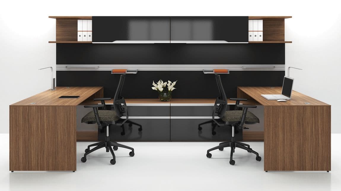 This modern office desk design features “floating' or “tiered' components that provide dimension and visual interest while packing ample “stackable' storage into a compact footprint. It can be configured as an L-Shape Desk, U-Shape desk or an integrated collaborative Shared Desk composition. All desk configurations are available in a number of sizes to fit any executive or shared office. The filing and storage components have sleek European continuous pulls and the design option of applying either Gloss White or Gloss Black laminate to the drawer facings for an ultra modern textural nuance. The extra-wide versions of the filing and storage drawers also include hidden internal cubbies to store items such as a purse or extra pair of shoes. Numerous solid or two-tone finish options are available for the desk and storage components to create the optimal modern desk design to meld with your office interior.