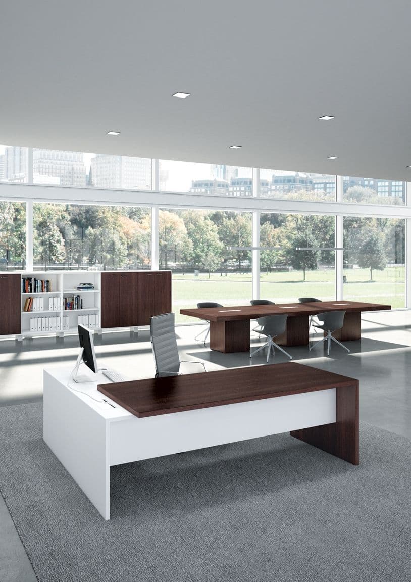 This Modern Office Desk design features clean lines, floating tops, beautiful Italian laminate finishes and a high level of design for the money. To compliment this sleek executive desk design is a comprehensive storage collection as well as small meeting tables and conference tables.
