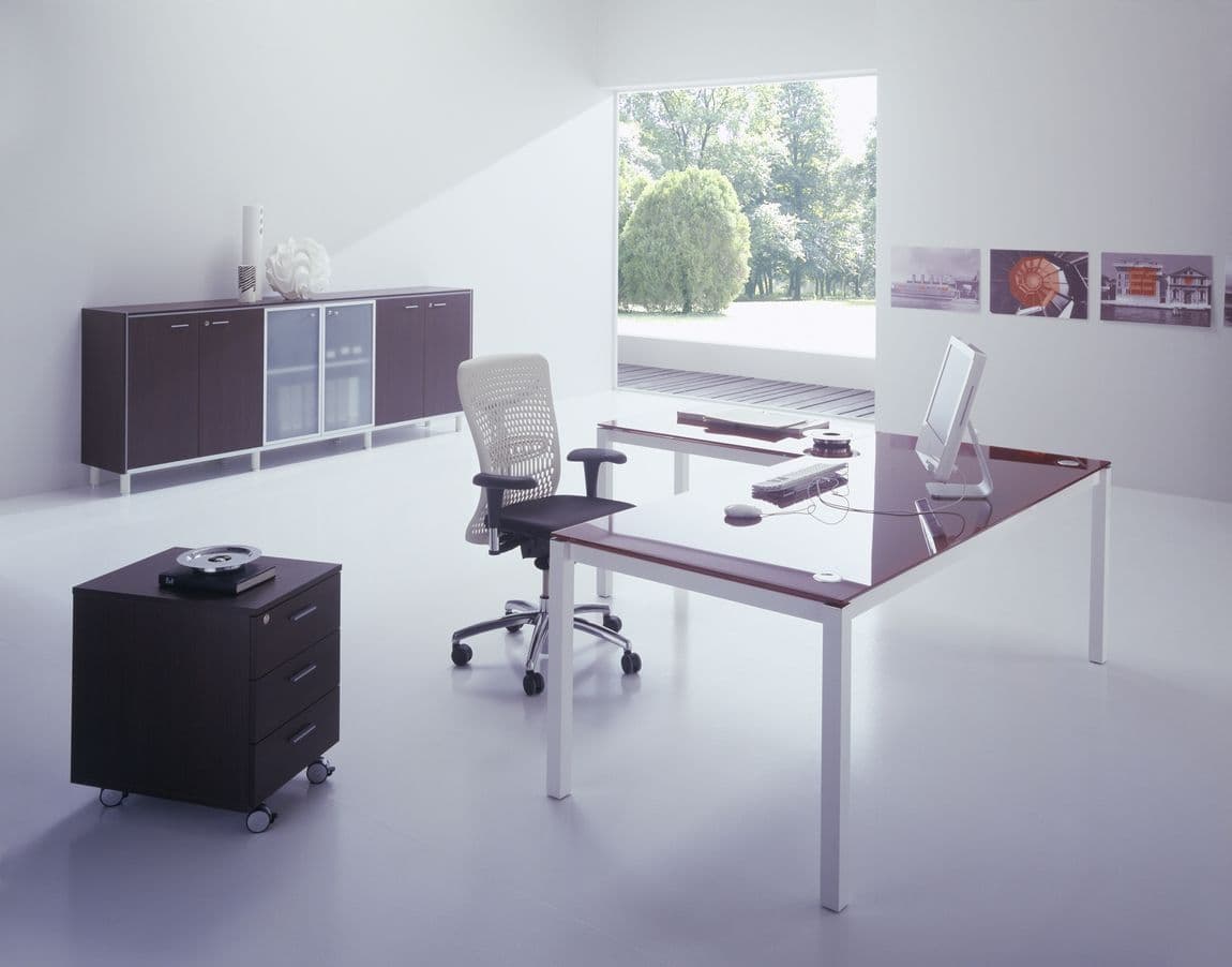 This modern glass desk design with a metal frame and legs is available in a number of sizes to fit any executive or shared office. It can be configured as a rectangular Table Desk, an L-Shape Desk or an integrated Shared Desk composition with a privacy screen. Numerous coordinating storage options are available in various sizes and finishes to fit any office space and satisfy any filing or general storage requirement.
