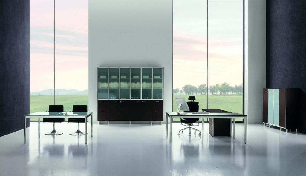 This modern glass desk design with a metal frame and legs is available in a number of sizes to fit any executive or shared office. It can be configured as a rectangular Table Desk, an L-Shape Desk or an integrated Shared Desk composition with a privacy screen. Numerous coordinating storage options are available in various sizes and finishes to fit any office space and satisfy any filing or general storage requirement.