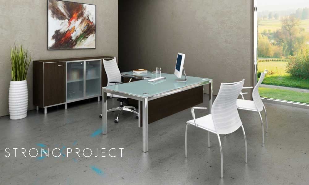 This modern glass desk design with a metal frame and legs is available in a number of sizes to fit any executive or shared office. It can be configured as a rectangular Table Desk, an L-Shape Desk or an integrated Shared Desk composition with a privacy screen. Numerous coordinating storage options are available in various sizes and finishes to fit any office space and satisfy any filing or general storage requirement.