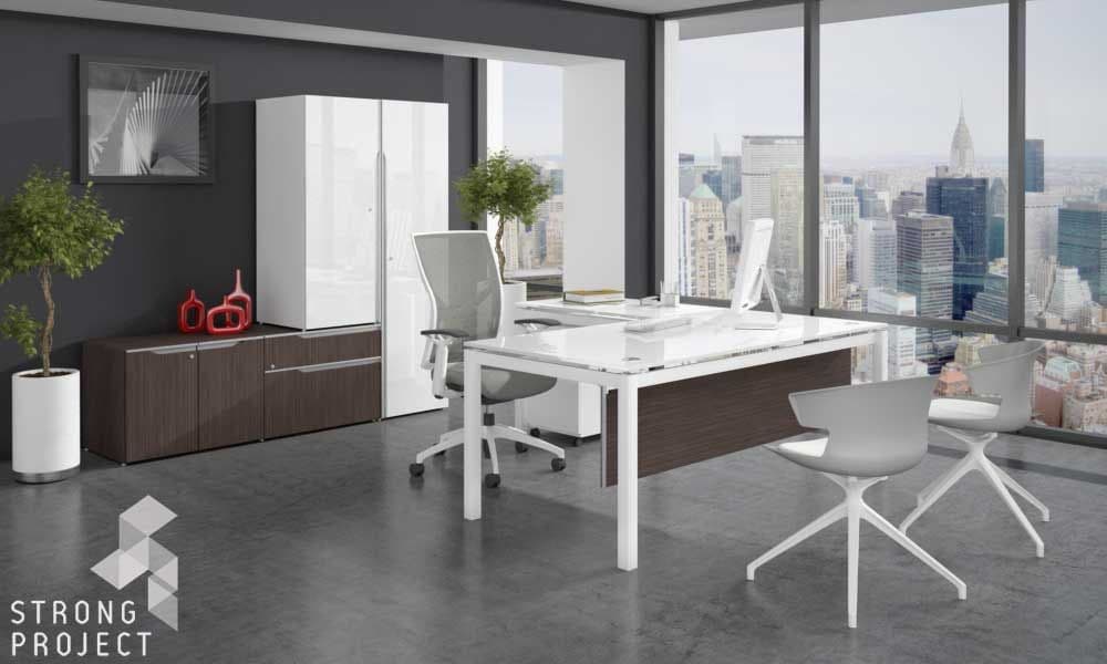 This modern glass desk design with a metal frame and legs is available in a number of sizes to fit any executive or shared office. It can be configured as a rectangular Table Desk, an L-Shape Desk or an integrated Shared Desk composition with a privacy screen. Numerous coordinating storage options are available in various sizes and finishes to fit any office space and satisfy any filing or general storage requirement.