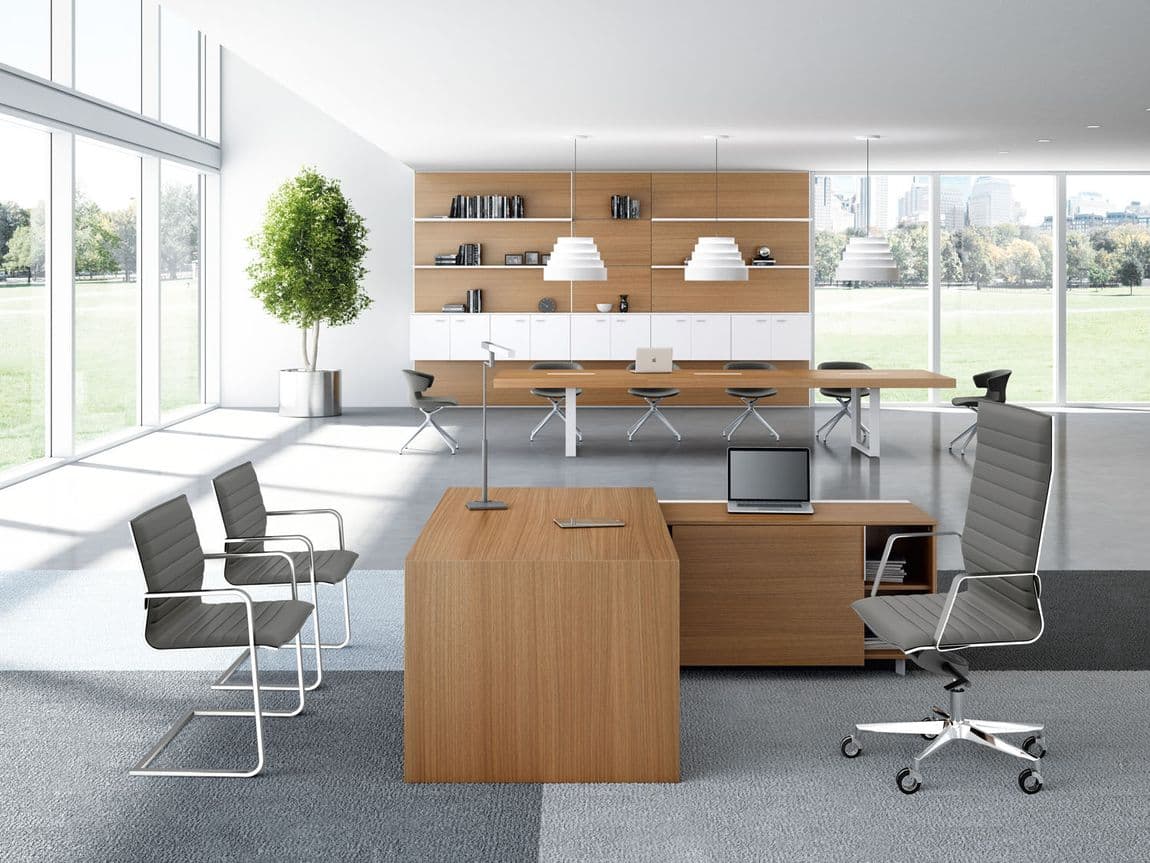This Modern Office Desk design features clean lines, floating tops, beautiful Italian laminate finishes and a high level of design for the money. To compliment this sleek executive desk design is a comprehensive storage collection as well as small meeting tables and conference tables.