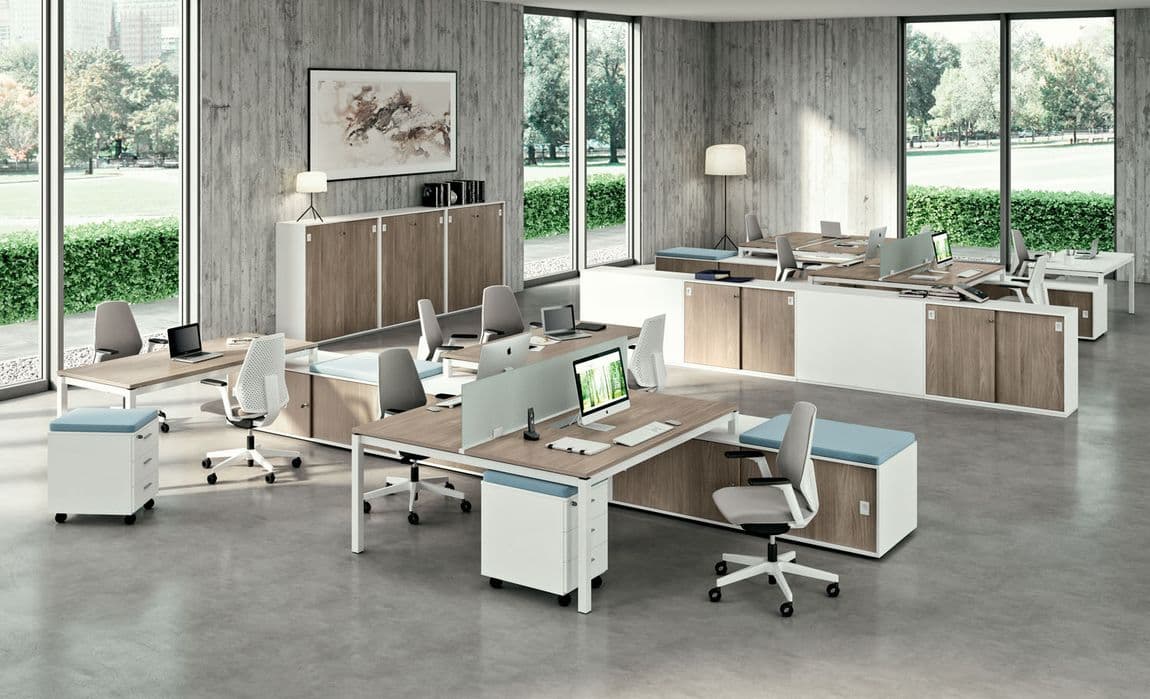 This contemporary office desk design is an ideal solution for businesses seeking a sleek, modern, tailored look and quality components at a price point geared toward staying within budget…especially on larger scale projects. This modern desk design features a durable thermofused laminate worksurface, metal frame and legs and is available in a number of sizes to fit any executive or shared office. It can be configured as a rectangular Table Desk, an L-Shape Desk or an integrated Shared Desk composition with a privacy screen.