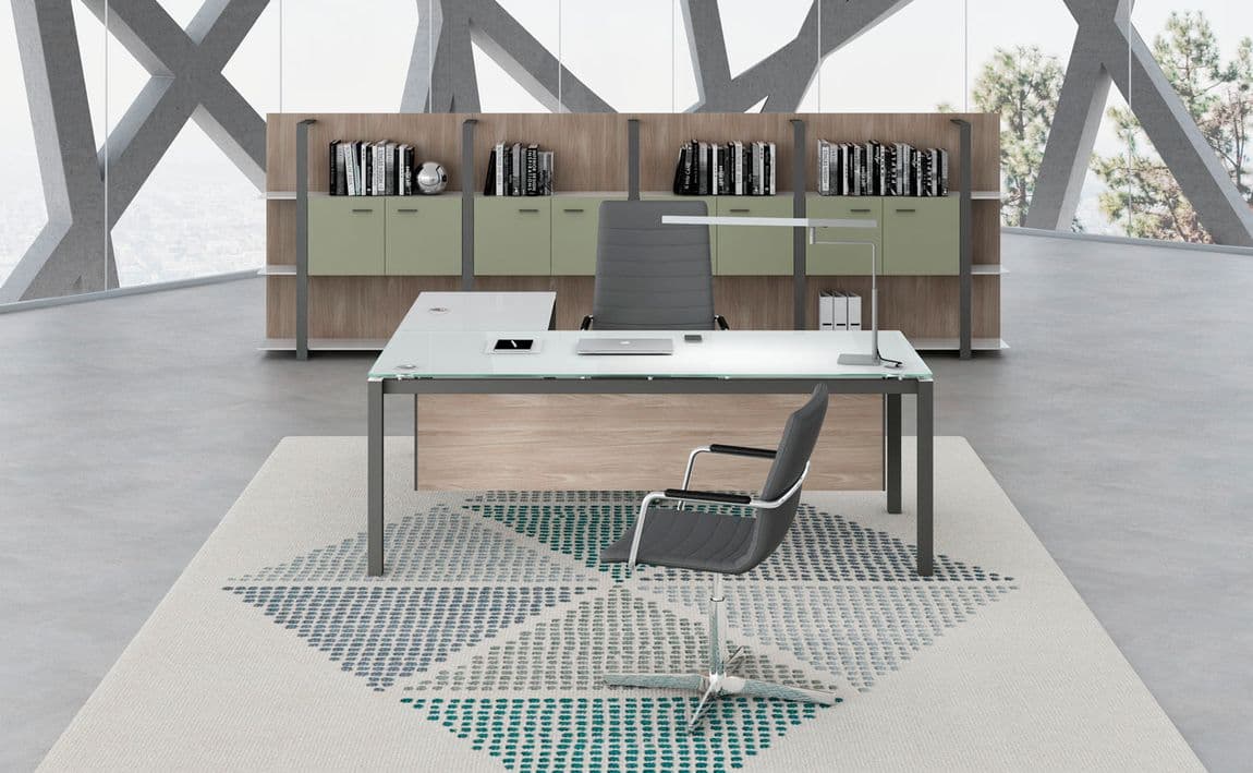 This modern glass desk design with a metal frame and legs is available in a number of sizes to fit any executive or shared office. It can be configured as a rectangular Table Desk, an L-Shape Desk or an integrated Shared Desk composition with a privacy screen. Numerous coordinating storage options are available in various sizes and finishes to fit any office space and satisfy any filing or general storage requirement.