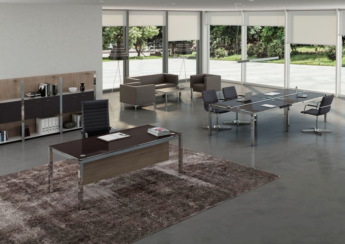 This modern glass desk design with a metal frame and legs is available in a number of sizes to fit any executive or shared office. It can be configured as a rectangular Table Desk, an L-Shape Desk or an integrated Shared Desk composition with a privacy screen. Numerous coordinating storage options are available in various sizes and finishes to fit any office space and satisfy any filing or general storage requirement.