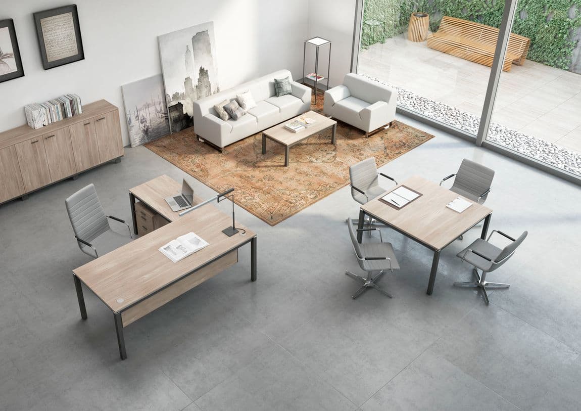 This contemporary office desk design is an ideal solution for businesses seeking a sleek, modern, tailored look and quality components at a price point geared toward staying within budget…especially on larger scale projects. This modern desk design features a durable thermofused laminate worksurface, metal frame and legs and is available in a number of sizes to fit any executive or shared office. It can be configured as a rectangular Table Desk, an L-Shape Desk or an integrated Shared Desk composition with a privacy screen.