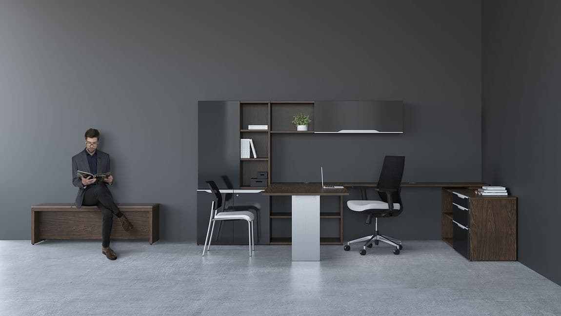 This modern office desk design features “floating' or “tiered' components that provide dimension and visual interest while packing ample “stackable' storage into a compact footprint. It can be configured as an L-Shape Desk, U-Shape desk or an integrated collaborative Shared Desk composition. All desk configurations are available in a number of sizes to fit any executive or shared office. The filing and storage components have sleek European continuous pulls and the design option of applying either Gloss White or Gloss Black laminate to the drawer facings for an ultra modern textural nuance. The extra-wide versions of the filing and storage drawers also include hidden internal cubbies to store items such as a purse or extra pair of shoes. Numerous solid or two-tone finish options are available for the desk and storage components to create the optimal modern desk design to meld with your office interior.