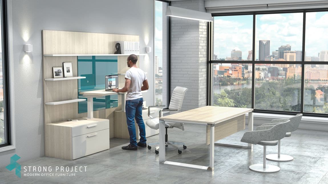 • Thoughtfully nested mechanisms for height adjustable worksurfaces ensure attractive wellness options while maintaining the main executive desk for meetings.
